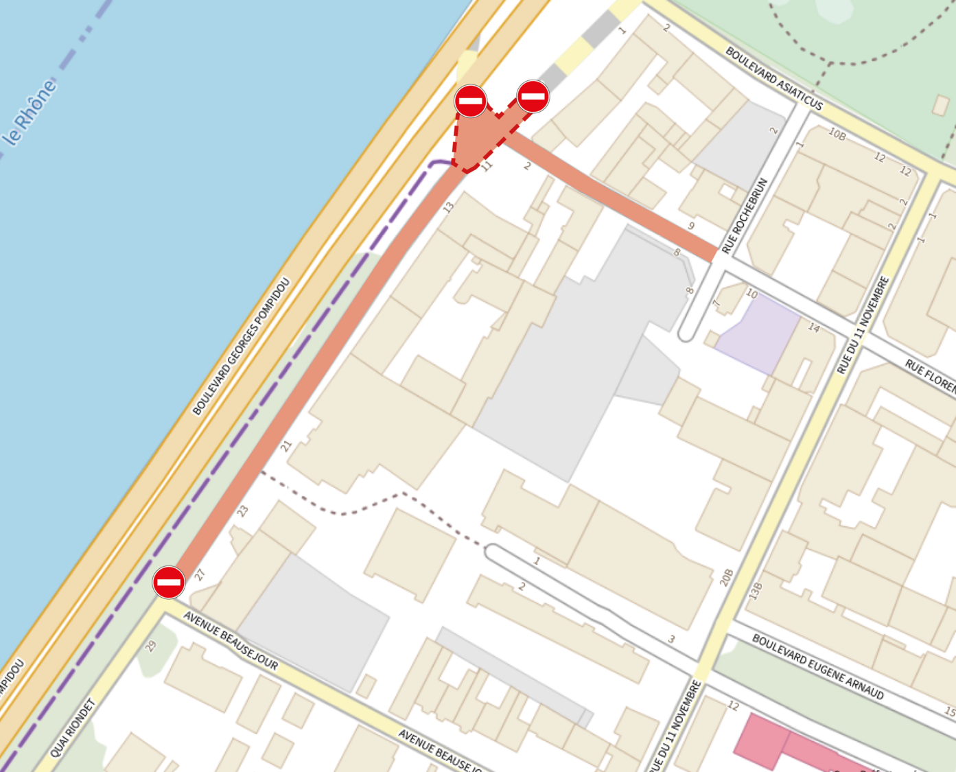 - Neutralisation du carrefour situé au niveau de la MJC avec impossibilité de rejoindre le quai Riondet (niveau MJC) en venant du boulevard Georges Pompidou (quais du Rhône)